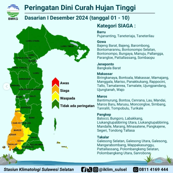 Untuk informasi lebih lanjut, masyarakat dapat menghubungi Stasiun Klimatologi Sulawesi Selatan di nomor 0811 4169 444 atau memantau perkembangan melalui kanal informasi resmi.