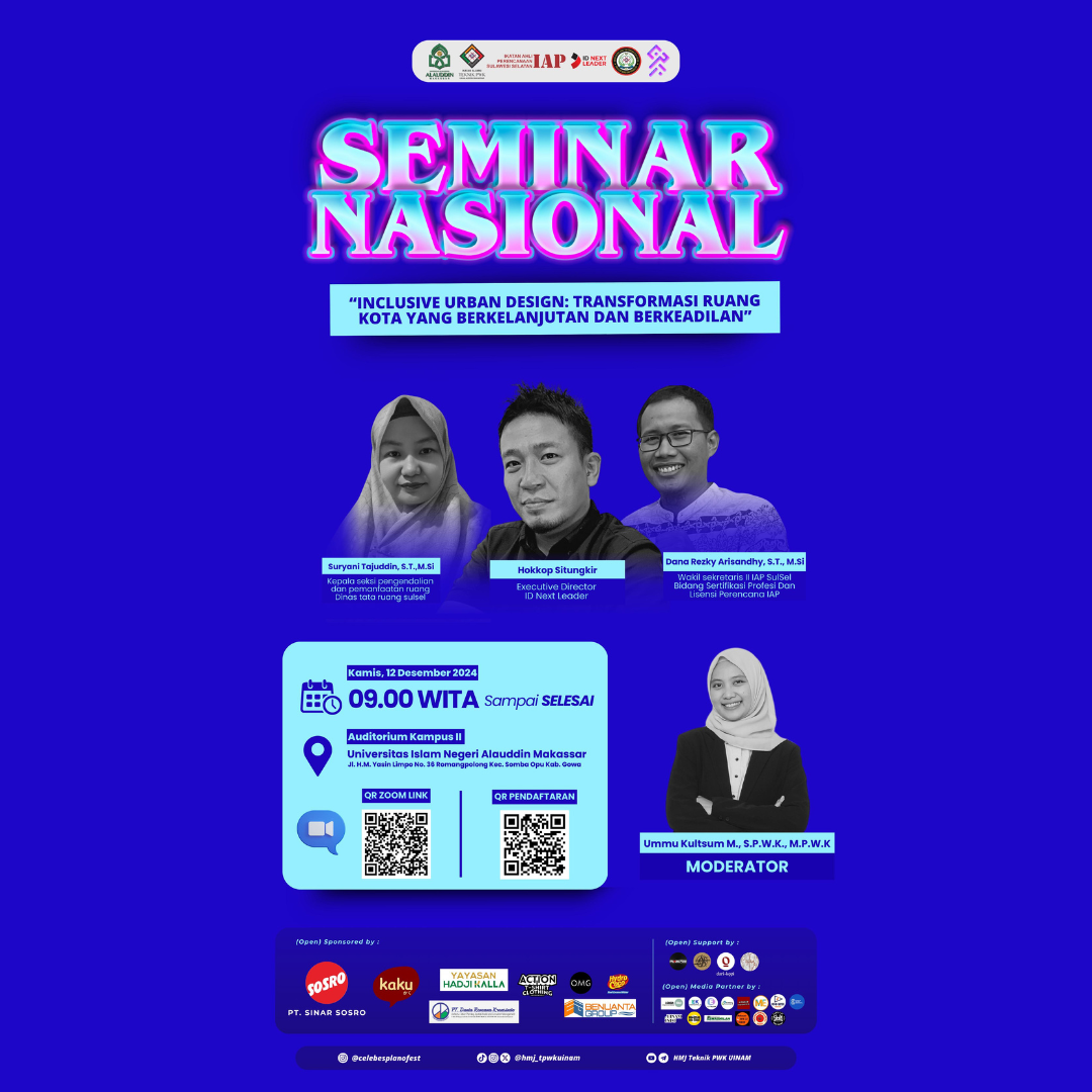 MAKASSAR,CAHAYASULSEL.COM – Program Studi Teknik Perencanaan Wilayah dan Kota (PWK) Universitas Islam Negeri Alauddin Makassar (UINAM) akan menggelar seminar nasional sebagai rangkaian acara Celebes Plano Festival 8.0. Rabu (11/12/2024)