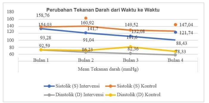 dikelompok intervensi untuk variabel manajemen diri meliputi kepatuhan kontrol tekanan darah, manajemen diet, manajemen pengobatan berkisar 57,50% – 64,30% yang tergolong cukup efektif. Hasil uji statistik memperlihatkan perbedaan yang signifikan pada tekanan darah sistolik dan diastolik dari bulan pertama sampai bulan keempat, pada kelompok intervensi disemua pengukuran tekanan darah sistolik dan diastolik terlihat perbedaan yang bermakna terjadi penurunan TD setiap bulan (p<0.05). Setelah 4 bulan intervensi, ada perbedaan yang signifikan pada kualitas hidup lansia dari domain fisik dan psikologis, sebelum dan sesudah perlakuan di kelompok intervensi (<0.05). Gambar penurunan tekanan darah setiap bulan (lihat gambar 1). Kesimpulan: Aplikasi SMH terbukti efektif dapat meningkatkan pengetahuan tentang HT, efikasi diri, manajemen diri dan mengendalikan TD serta kualitas hidup lansia dengan HT.