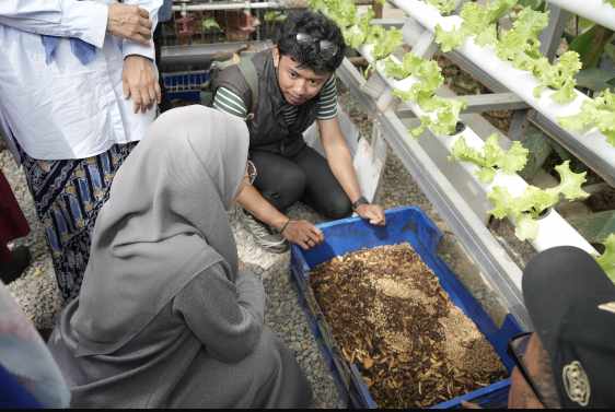 Dalam kesempatan tersebut, Melinda meninjau langsung praktik budidaya maggot atau larva Black Soldier Fly (BSF), yang menjadi salah satu elemen penting dalam sistem pertanian terpadu berbasis rumah tangga dan ramah lingkungan.