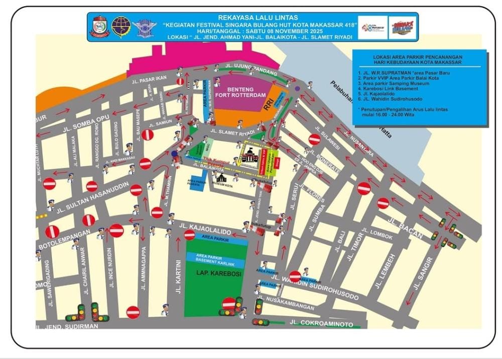 MAKASSAR, CAHAYASULSEL.COM – Menyambut pelaksanaan Festival Singara Bulang dalam rangka peringatan Hari Jadi ke-418 Kota Makassar, Pemerintah Kota Makassar akan memberlakukan rekayasa lalu lintas sementara pada Sabtu, 8 November 2025, mulai pukul 16.00 hingga 24.00 WITA.